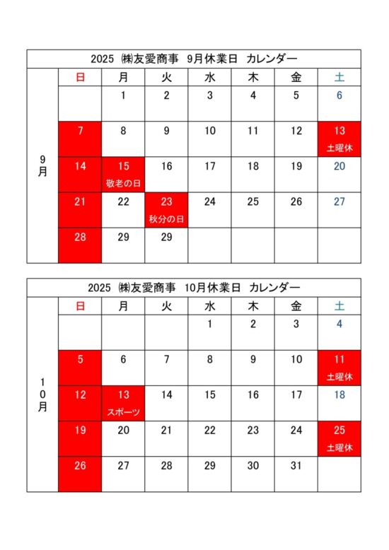 ㈱友愛商事の9~10月の休業日のお知らせです。